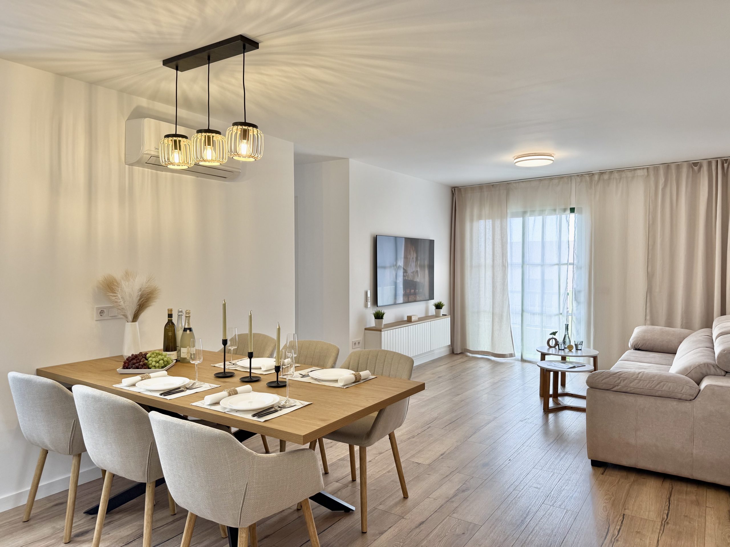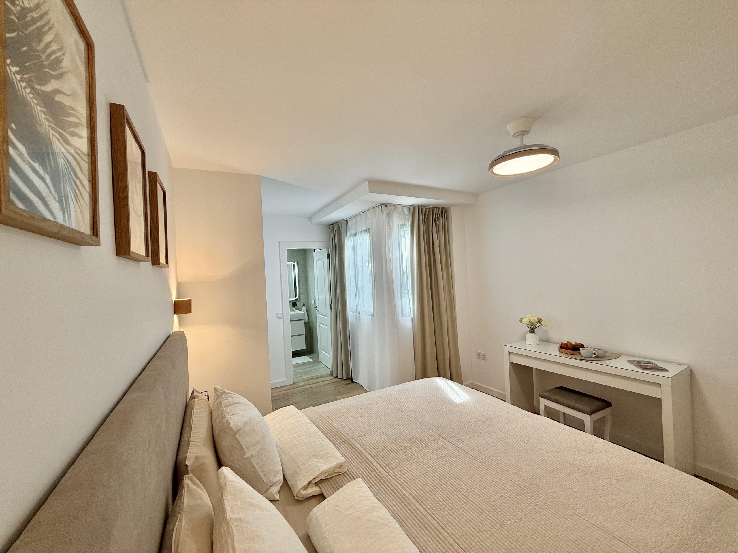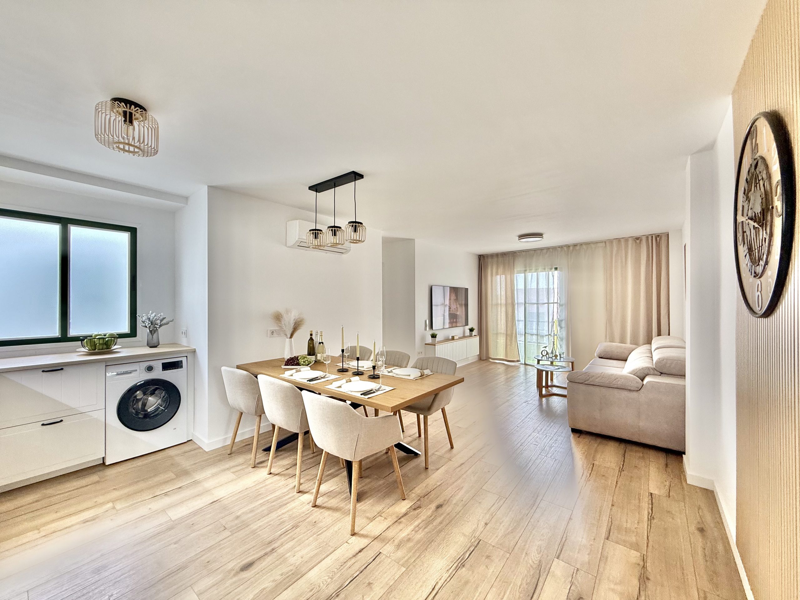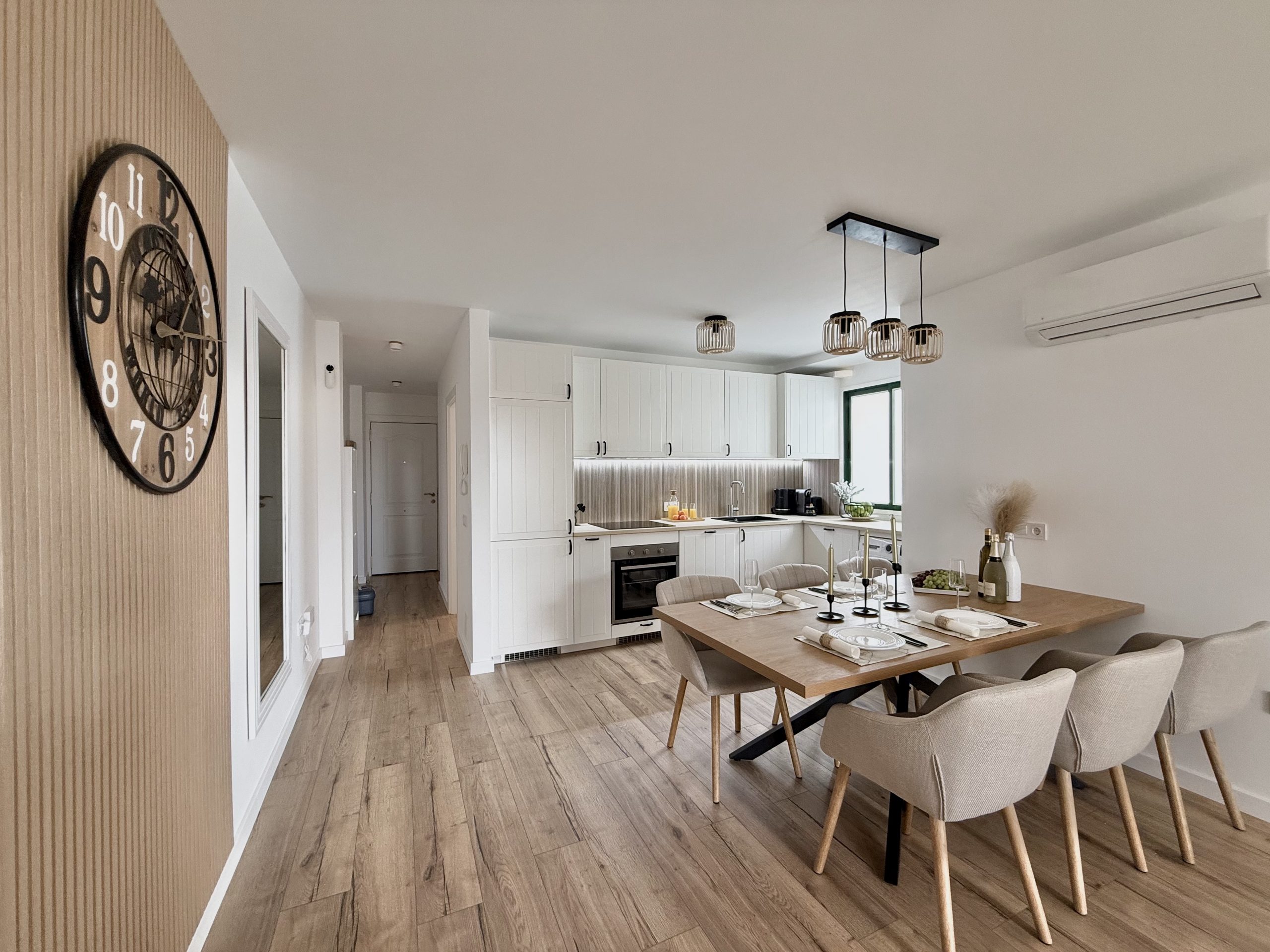 Интерьер выполнен в спокойной нейтральной цветовой гамме с использованием натуральных текстур и светлых тонов. Апартамент продается с мебелью и техникой, включая встроенную кухню, бытовые приборы и кондиционер. Большие окна обеспечивают хороший естественный свет.