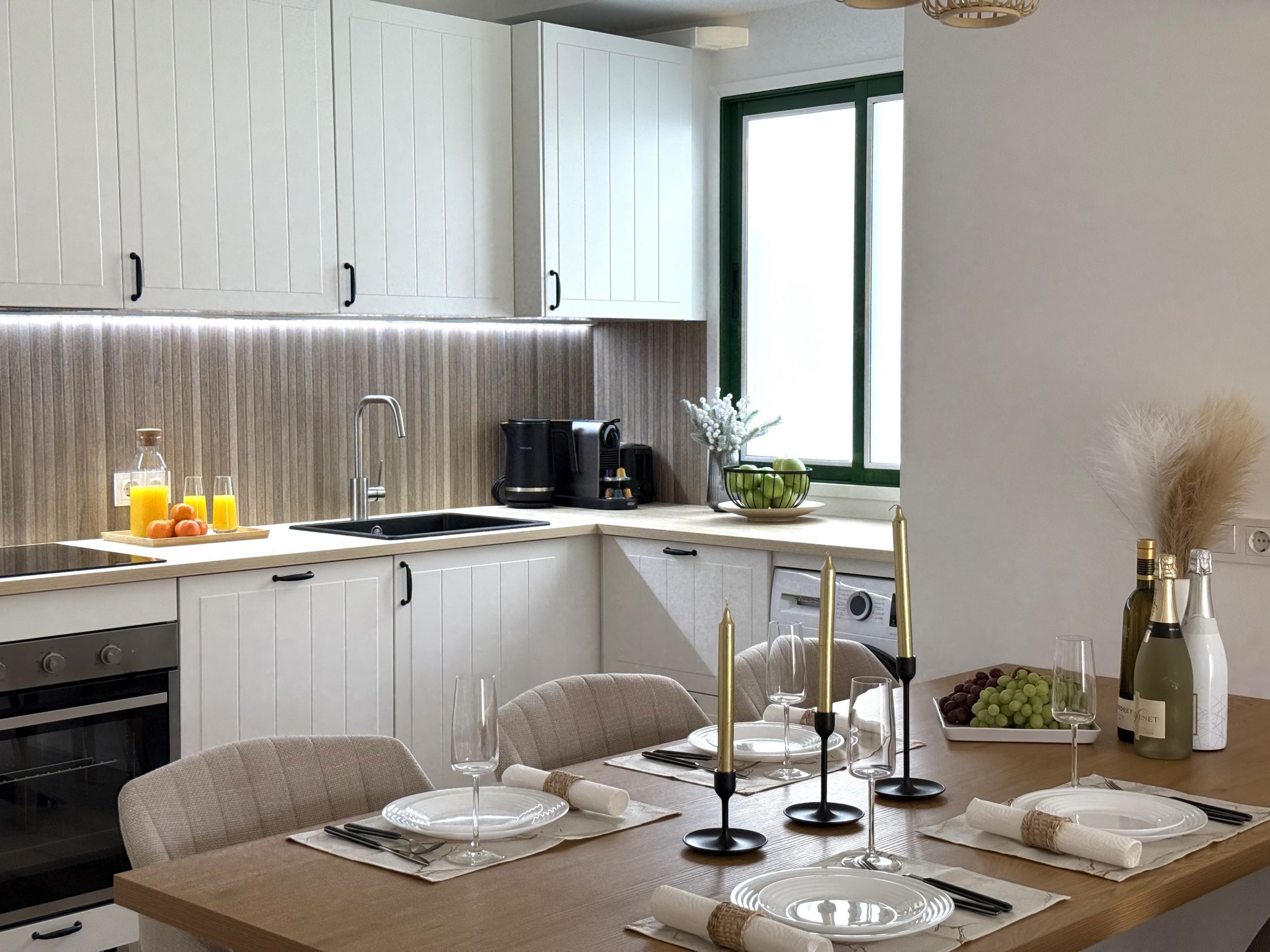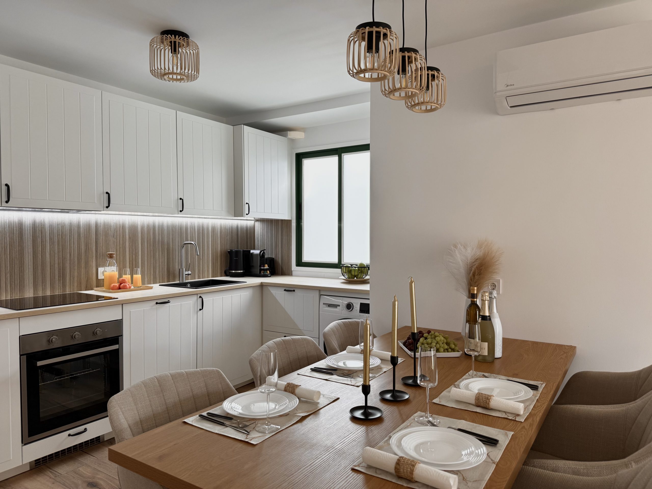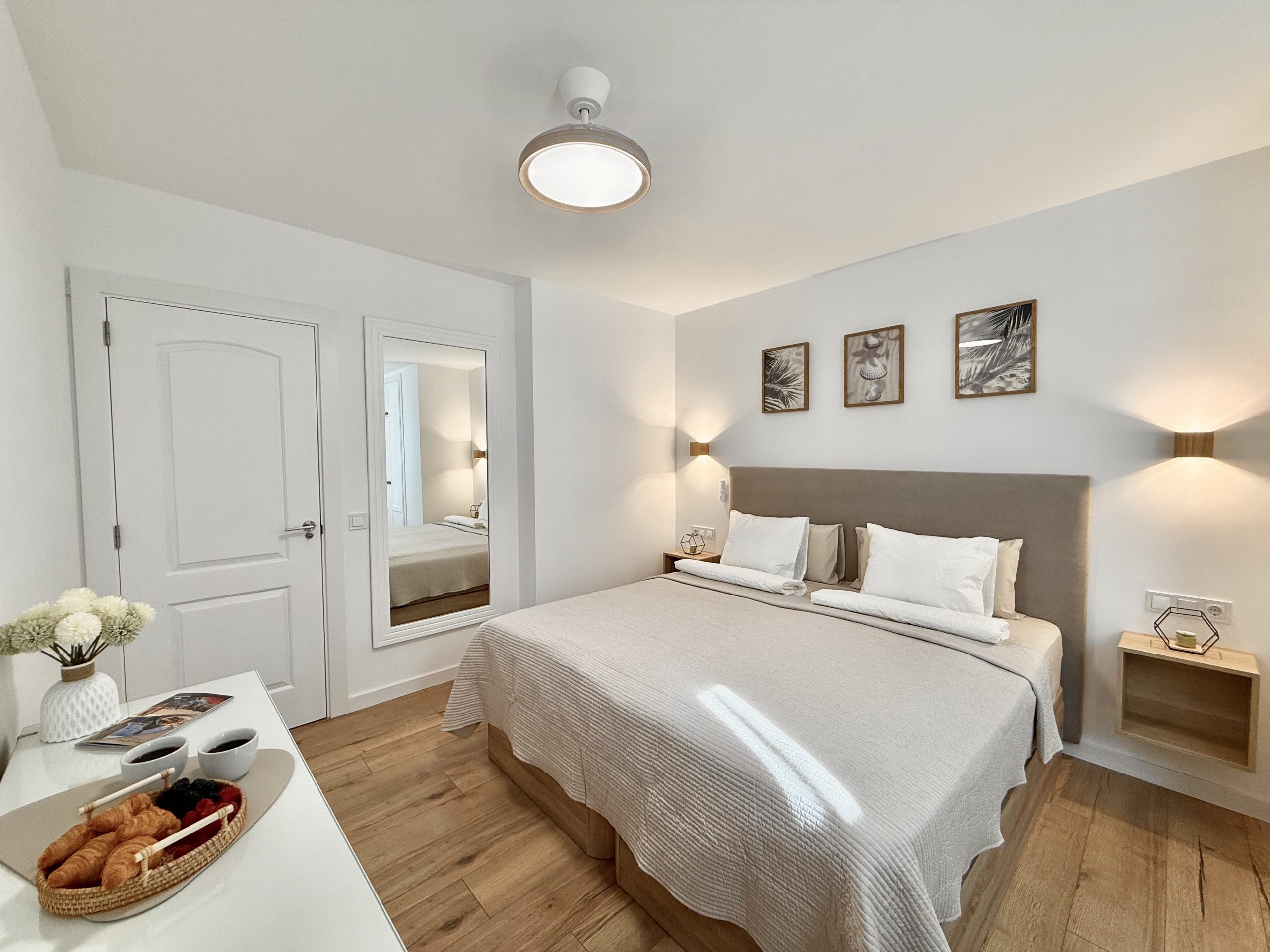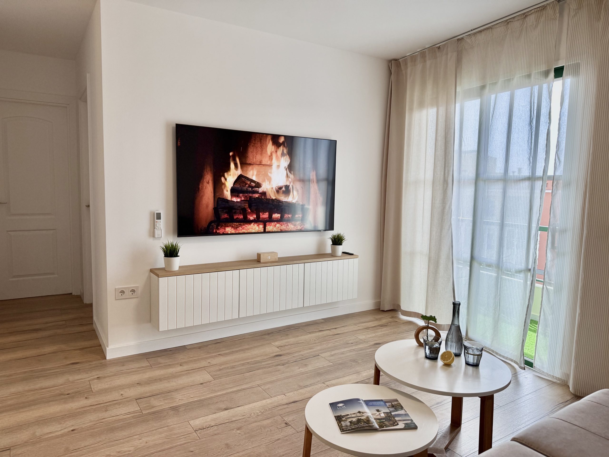 Интерьер выполнен в спокойной нейтральной цветовой гамме с использованием натуральных текстур и светлых тонов. Апартамент продается с мебелью и техникой, включая встроенную кухню, бытовые приборы и кондиционер. Большие окна обеспечивают хороший естественный свет.