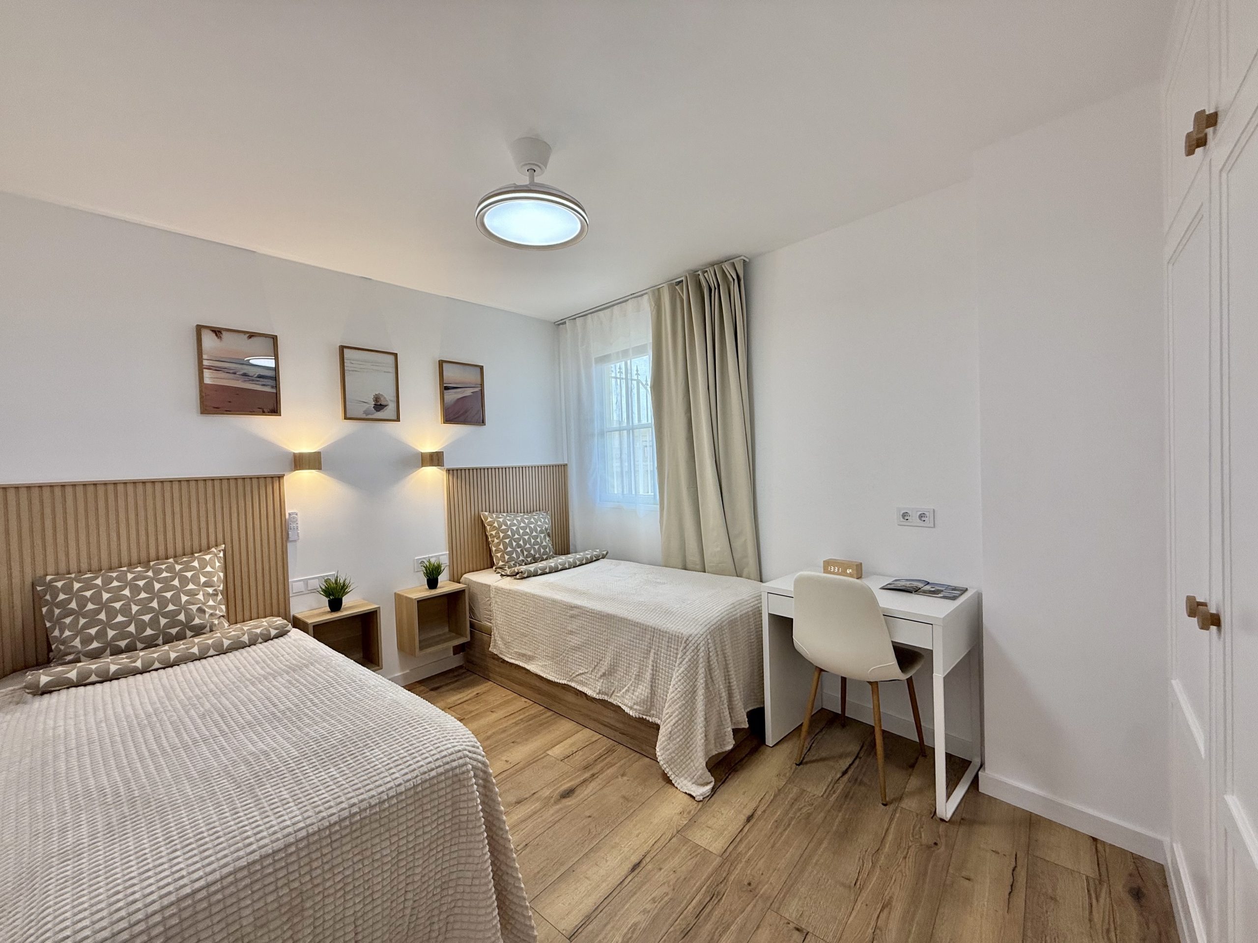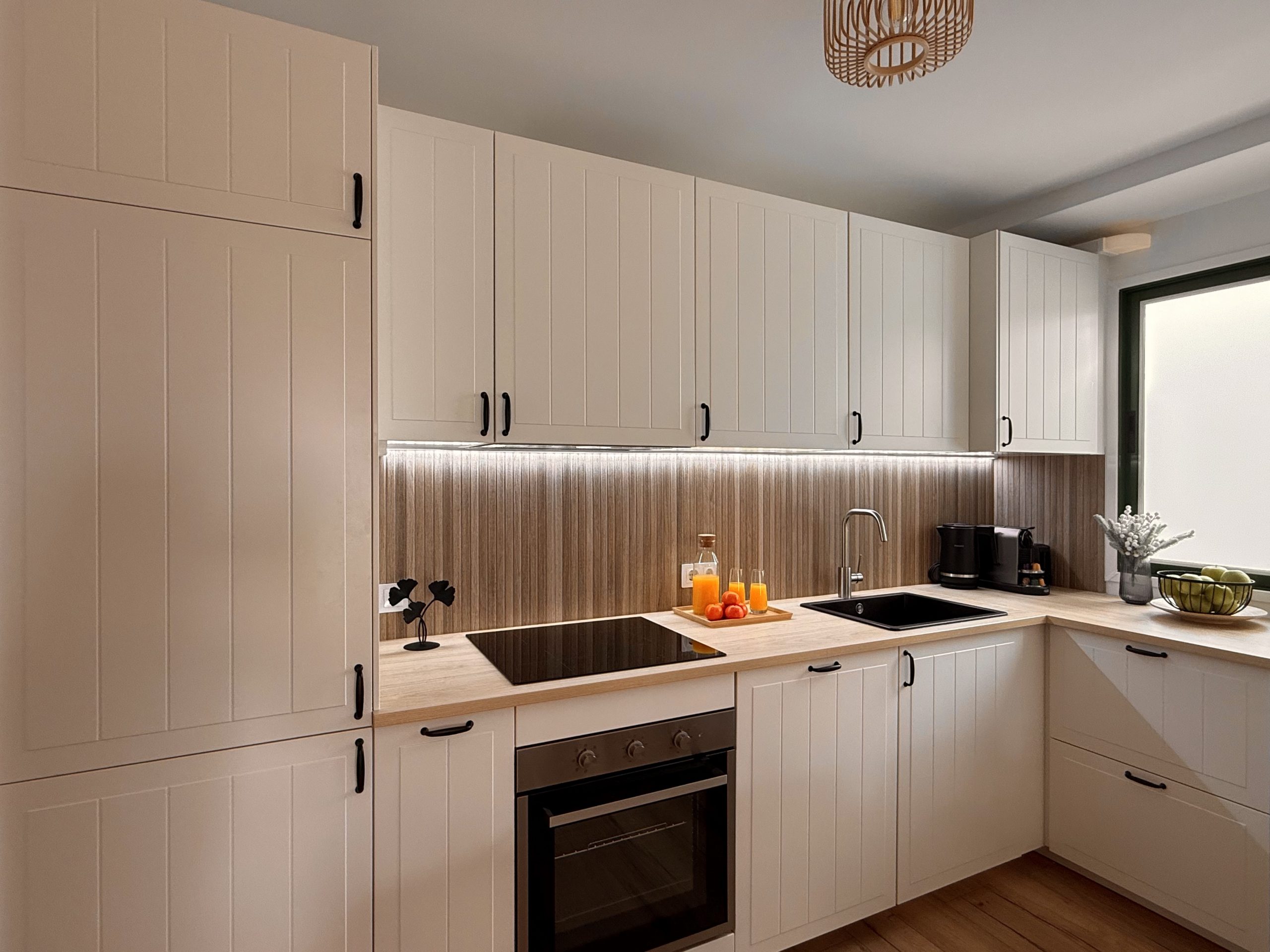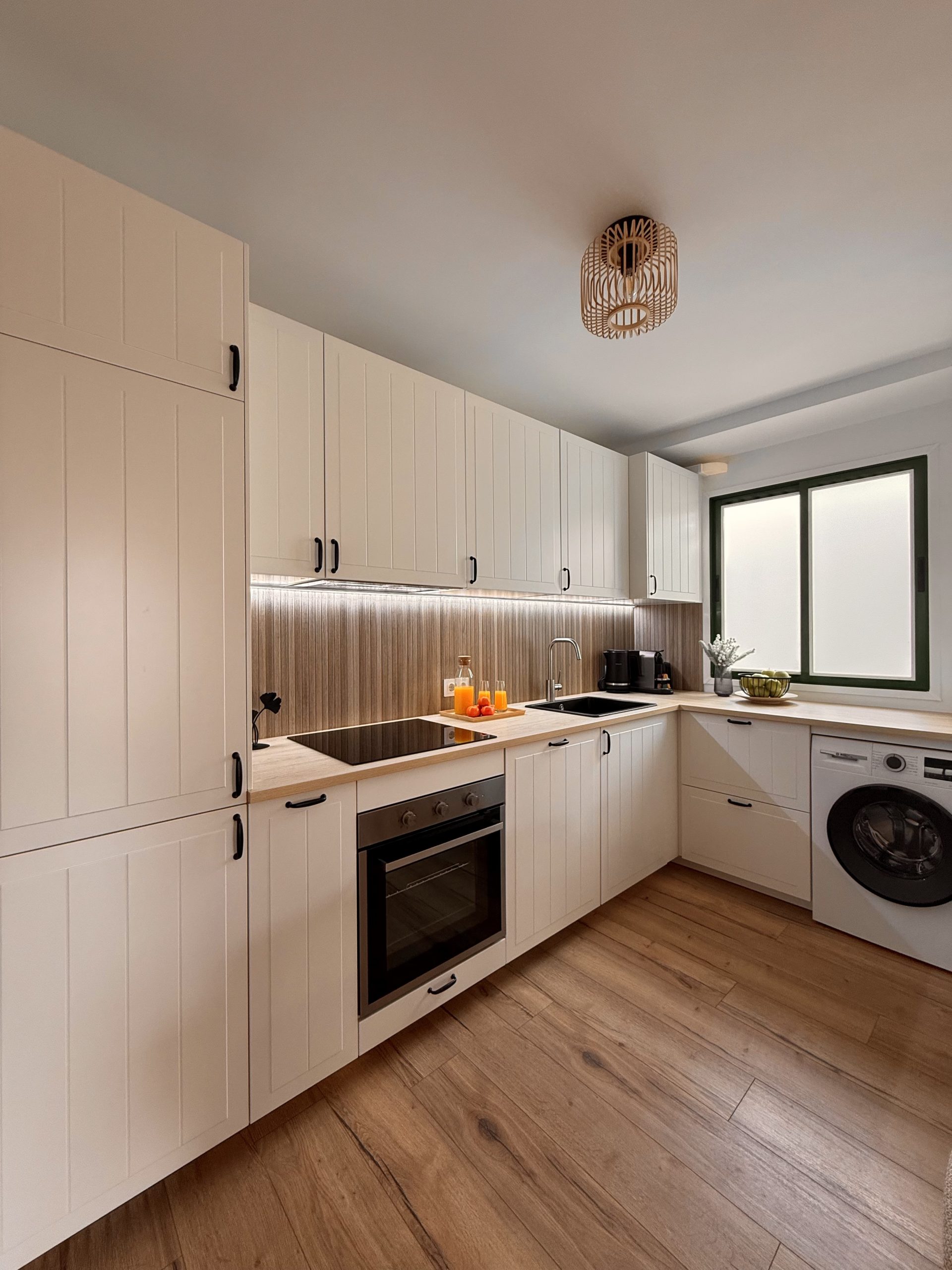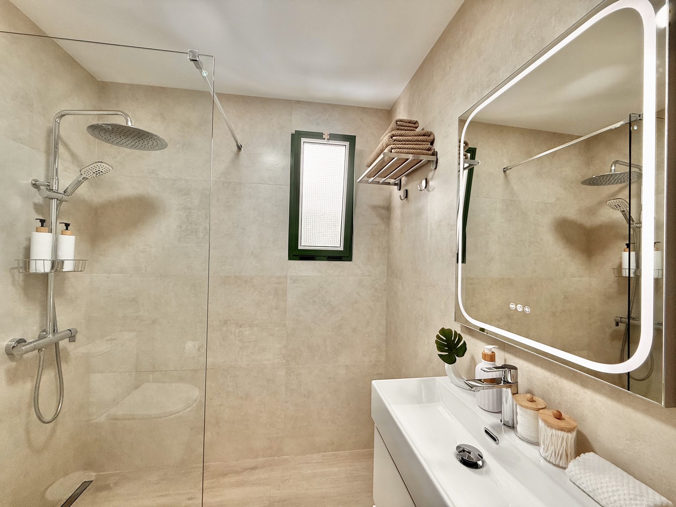 Интерьер выполнен в спокойной нейтральной цветовой гамме с использованием натуральных текстур и светлых тонов. Апартамент продается с мебелью и техникой, включая встроенную кухню, бытовые приборы и кондиционер. Большие окна обеспечивают хороший естественный свет.