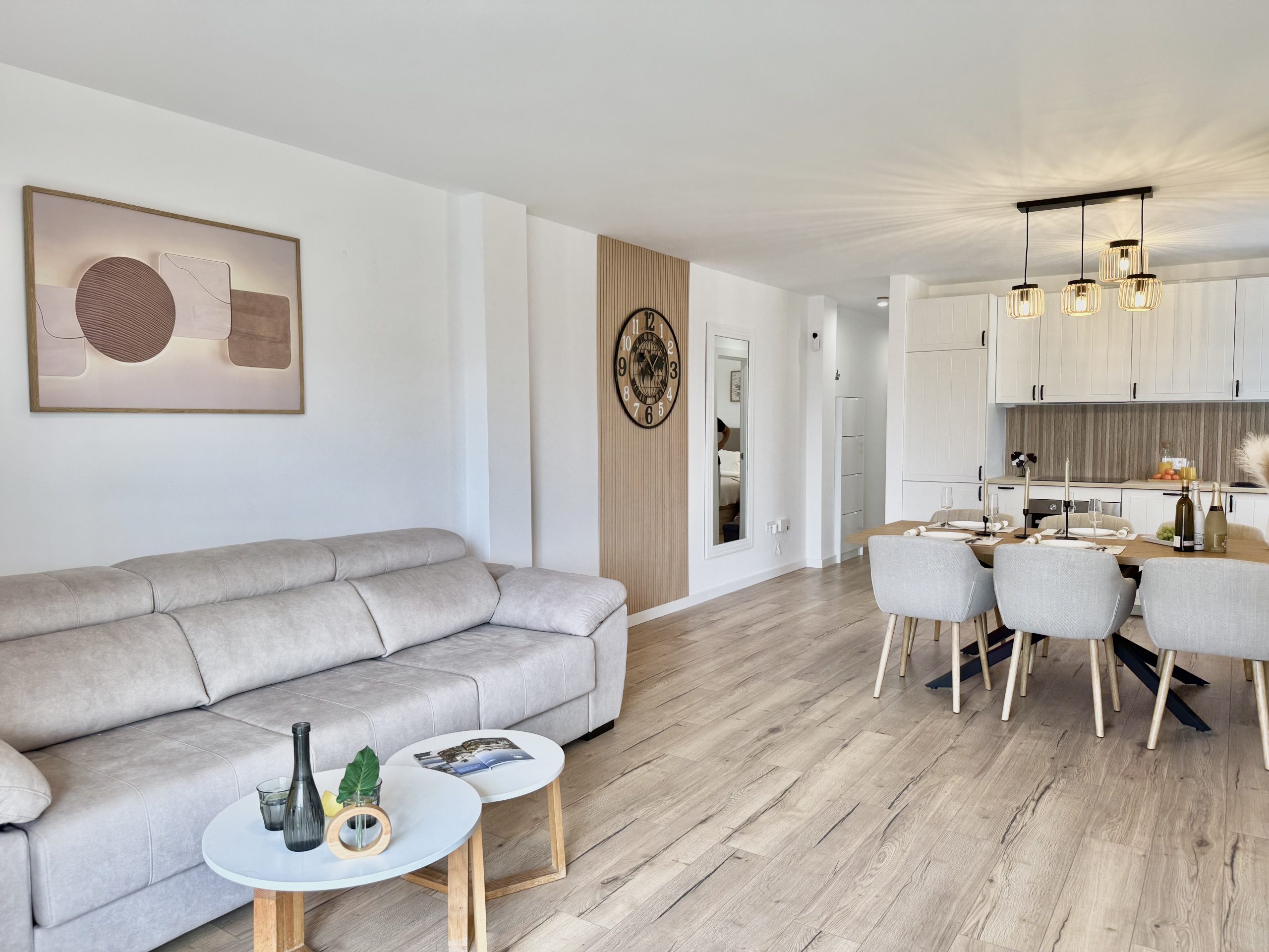 Предлагаем стильный апартамент с качественным современным ремонтом, полностью готовый к проживанию или сдаче в аренду. Апартамент имеет светлую гостиную с обеденной зоной и красивой, полностью оборудованной кухней открытого типа. Ванные комнаты оборудованны современно с использованием качественных материалов.