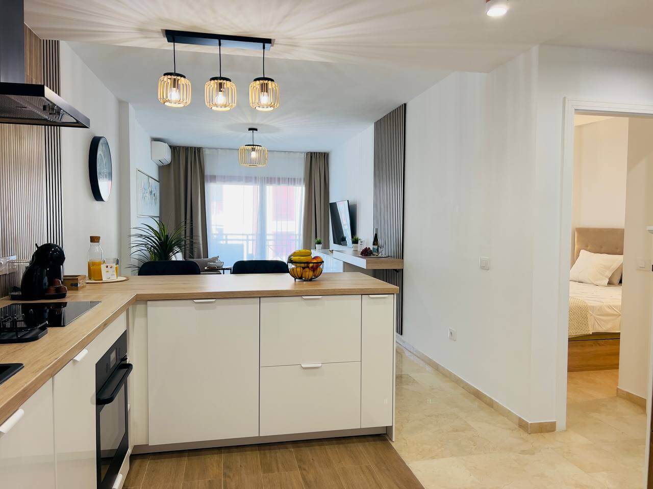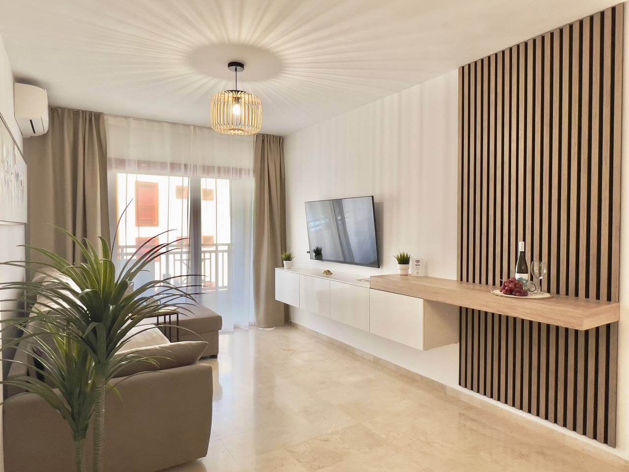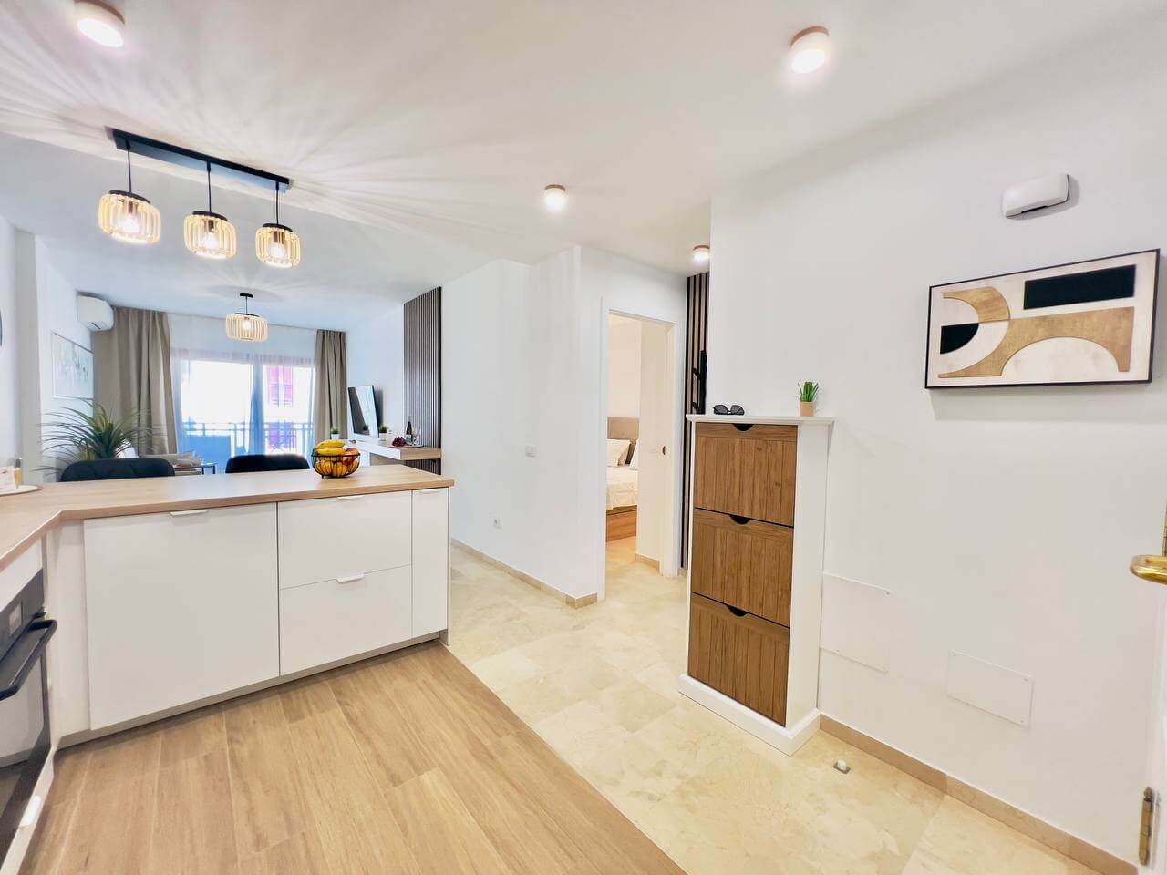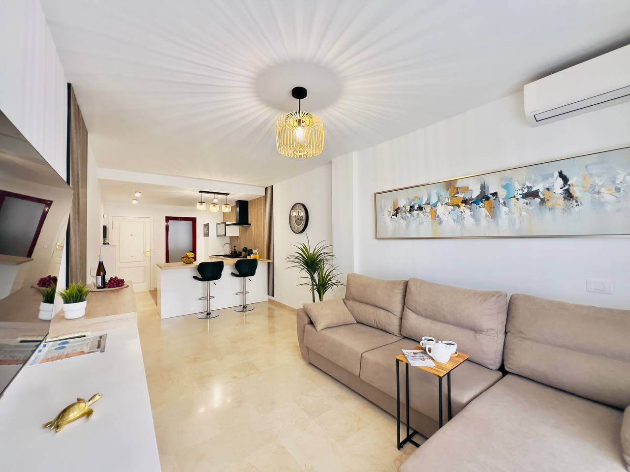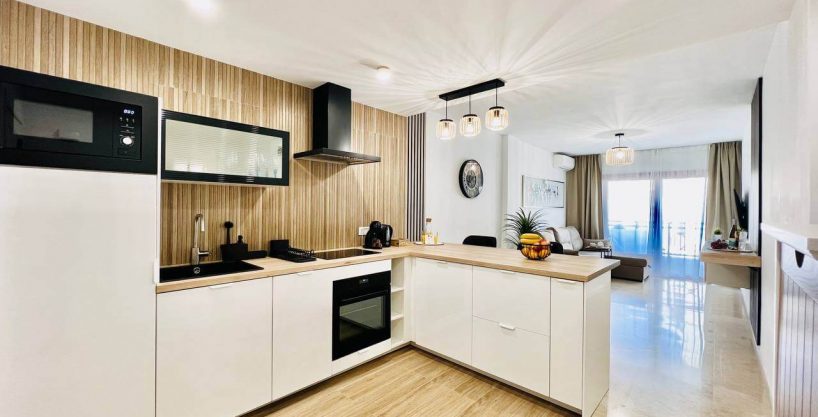 Этот современный апартамент в комплексе Лос Баландрос, Паль Мар, радует удачной планировкой и стильным интерьером. Светлая гостиная с уютной зоной отдыха плавно переходит в кухню с барной стойкой — это удобное пространство для жизни и приёма гостей.