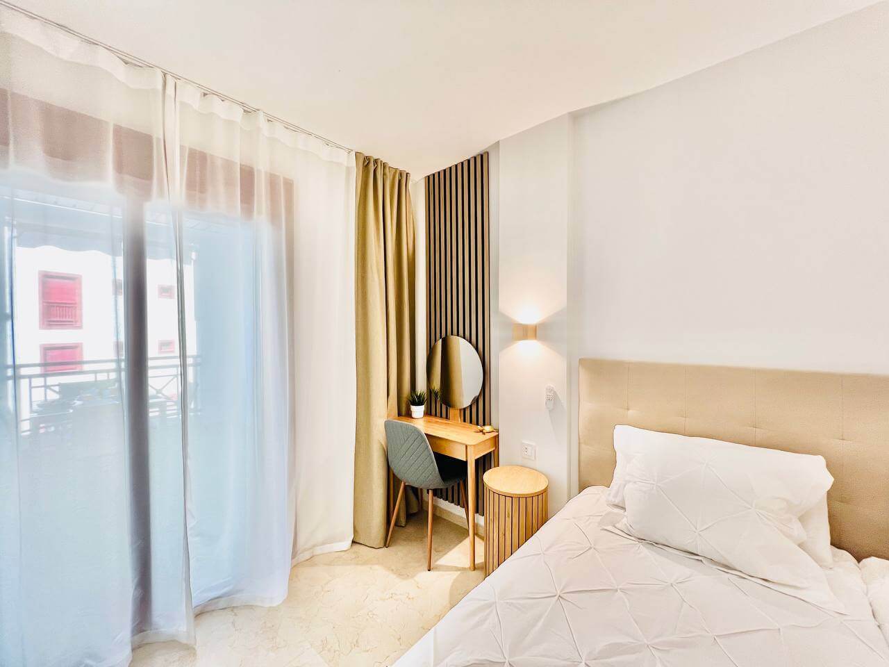 Спальня выполнена в спокойных тонах, с выходом на балкон и продуманными деталями интерьера. Ванная комната современная и просторная, с качественной отделкой. Особое удовольствие доставляет терраса, где можно завтракать на свежем воздухе и любоваться видом на зелёную территорию комплекса.