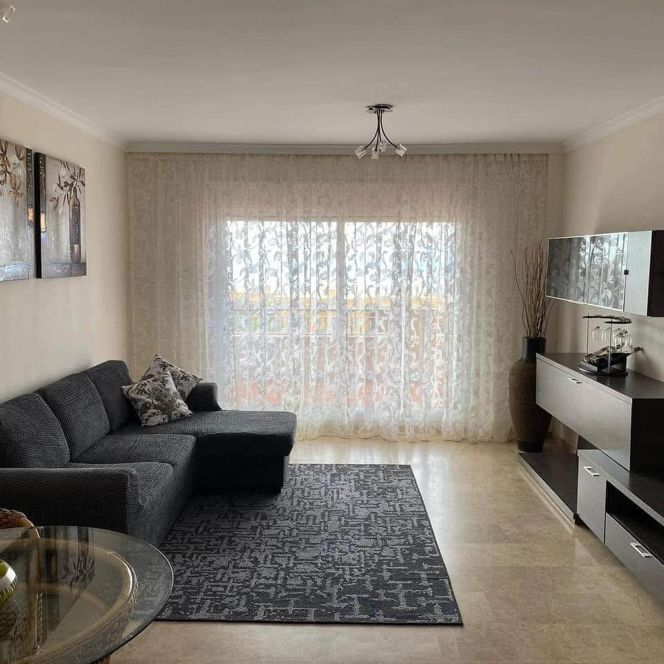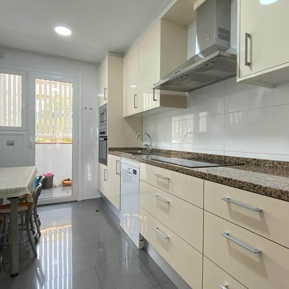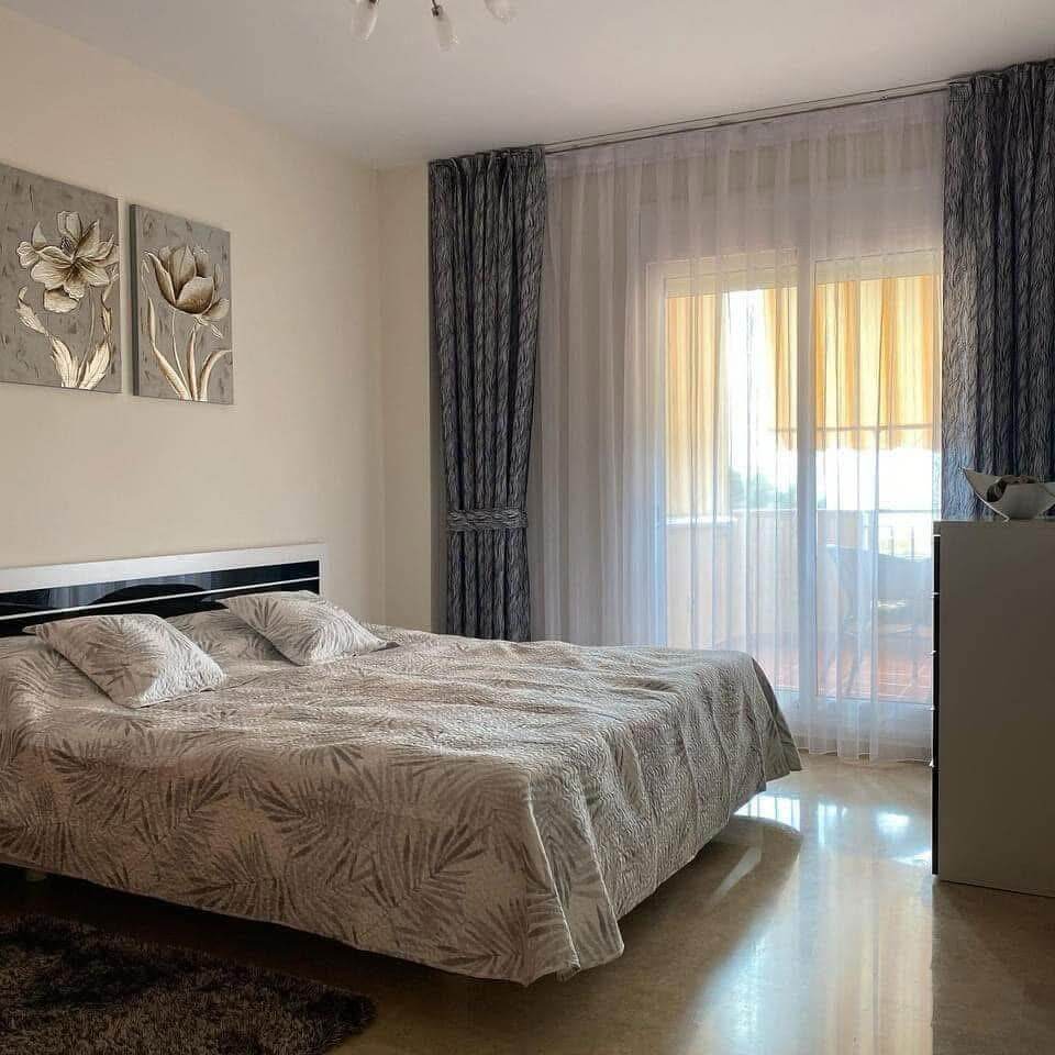 Внутри квартира светлая и уютная. Просторная гостиная с большим окном выходит на террасу, наполняя пространство естественным светом. Спальни оформлены в спокойных тонах, достаточно просторные, есть встроенные шкафы для хранения. Отдельного внимания заслуживает кухня — она полностью оборудована и располагает всем необходимым для комфортной готовки.