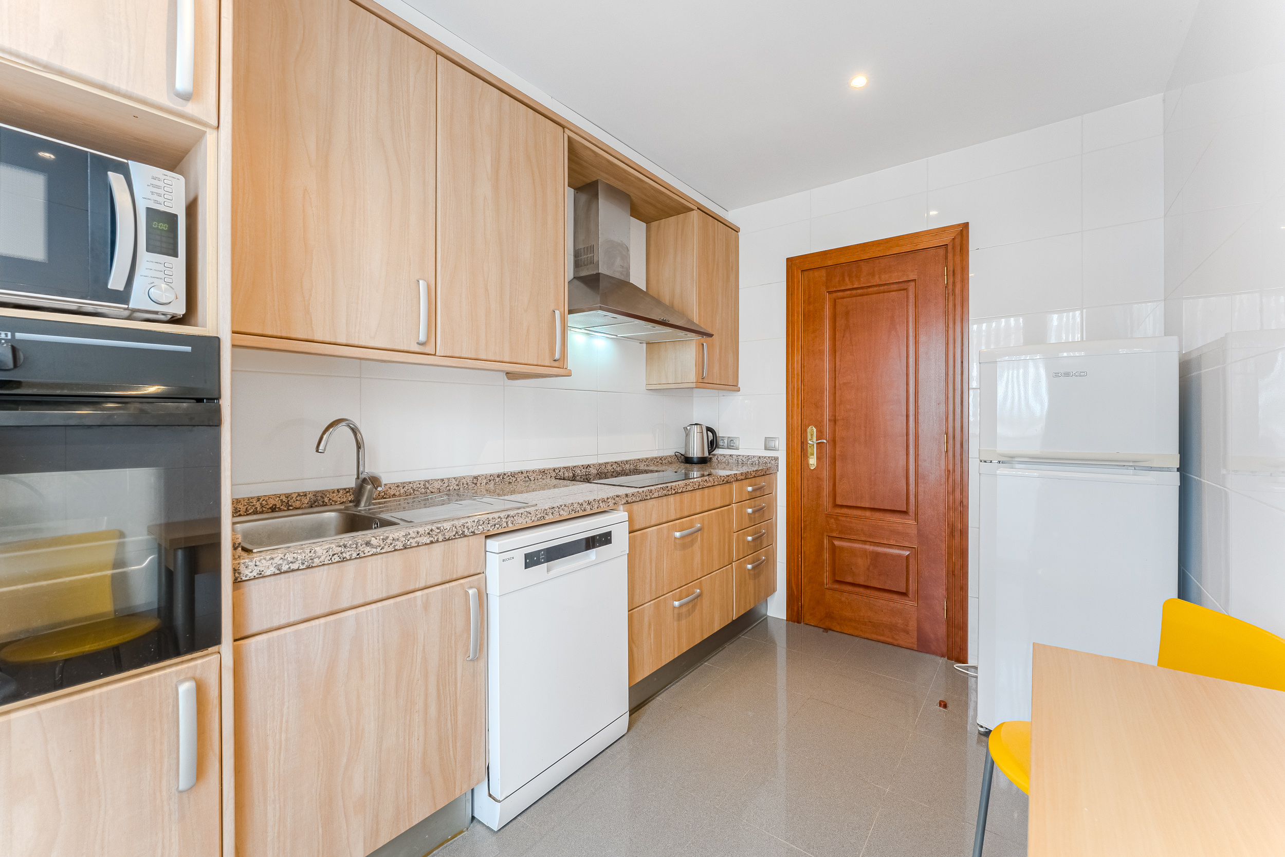 Внутри квартира очень светлая. Гостиная просторная, светлая с окнами в пол. Стены спален выкрашены в белый цвет, достаточно просторные, есть встроенные шкафы для хранения. Кухня в квартире светлая, с выходом на технический балкон, где есть раковина.