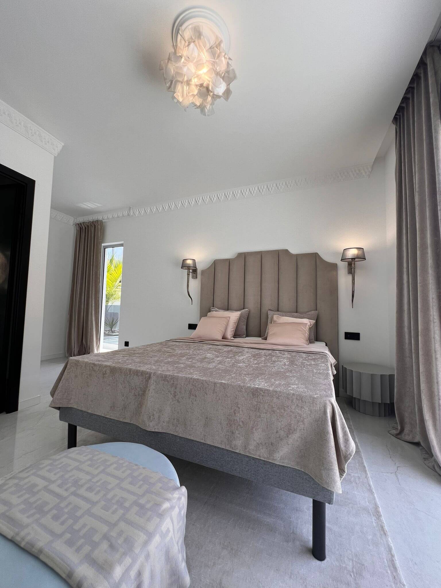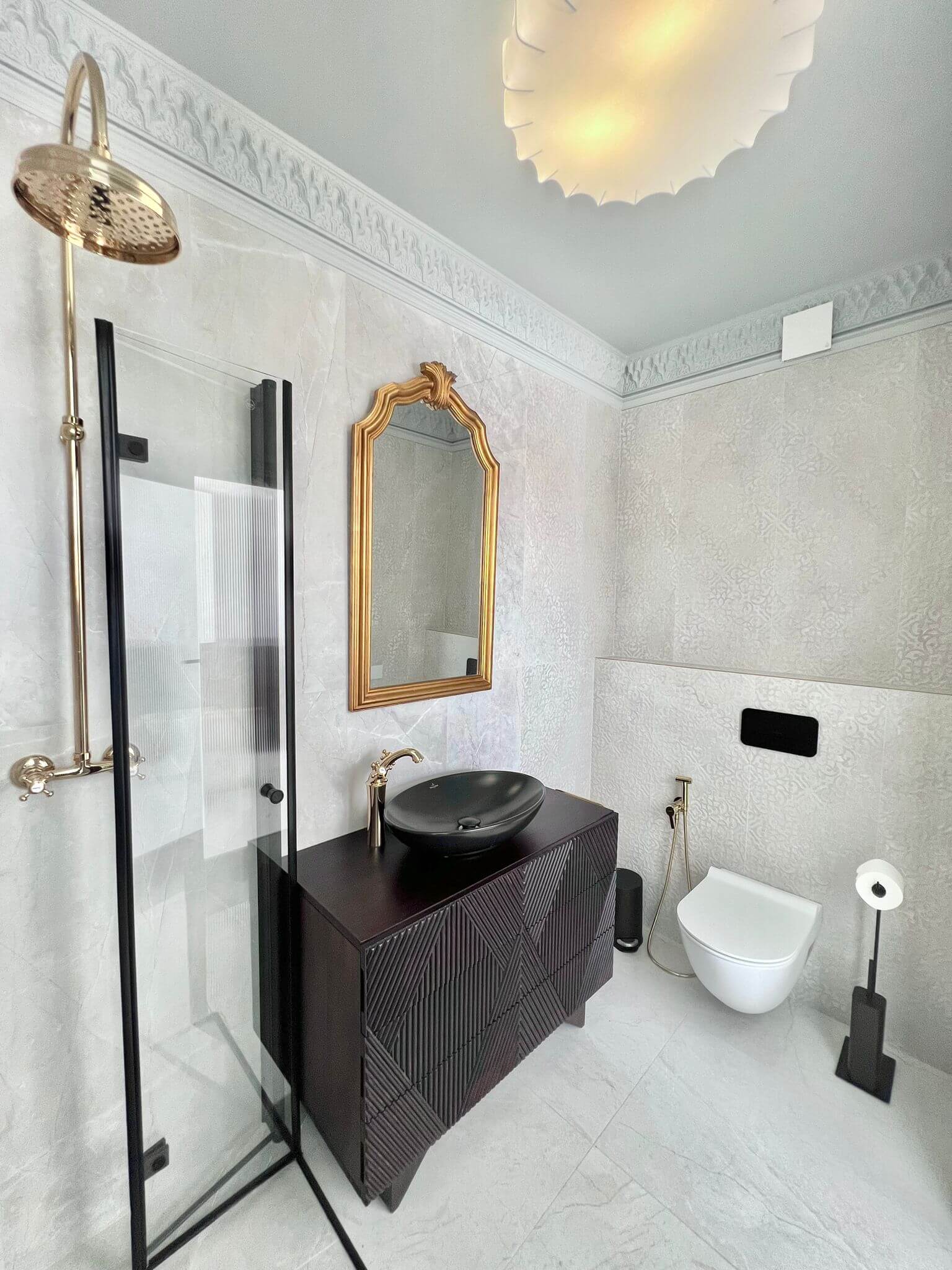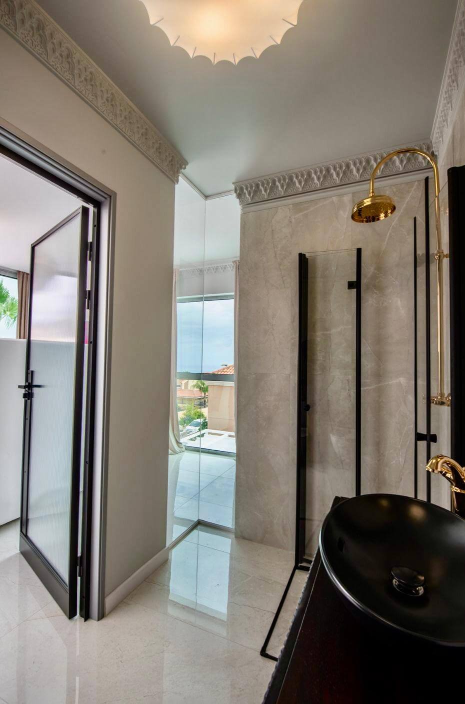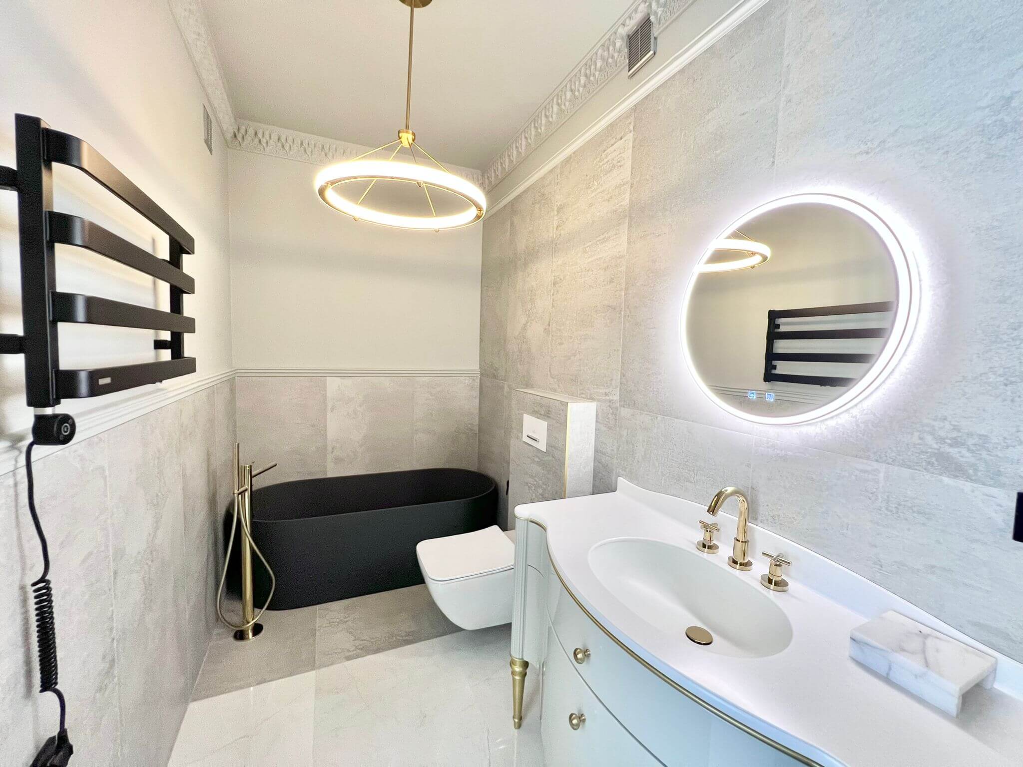 Спальня продумана для отдыха и спокойных утр — мягкие тона, простор и прямой выход на террасу с шезлонгами. Ванная комната выполнена в современном стиле: изящная чёрная ванна, светящееся зеркало и золотые детали добавляют ей особого шарма.