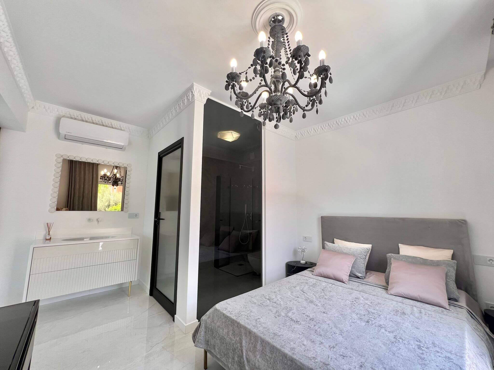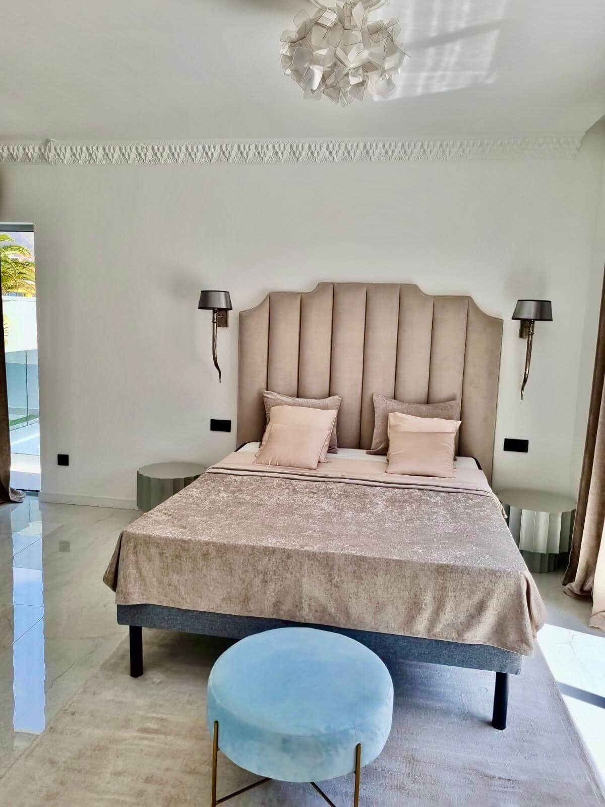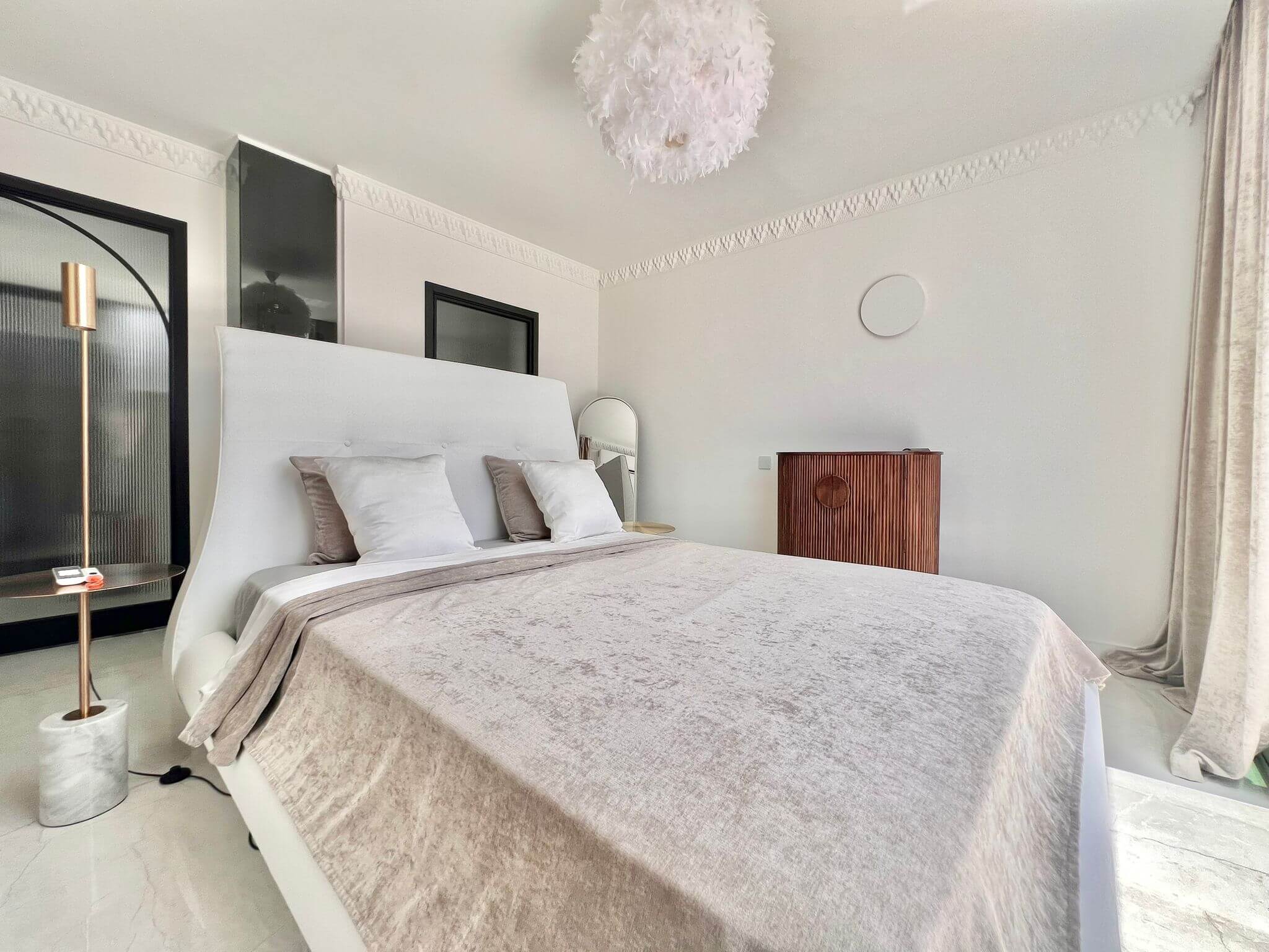 Спальня продумана для отдыха и спокойных утр — мягкие тона, простор и прямой выход на террасу с шезлонгами. Ванная комната выполнена в современном стиле: изящная чёрная ванна, светящееся зеркало и золотые детали добавляют ей особого шарма.