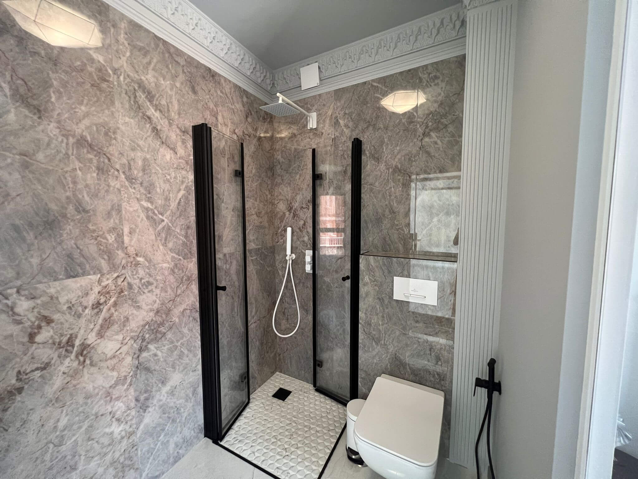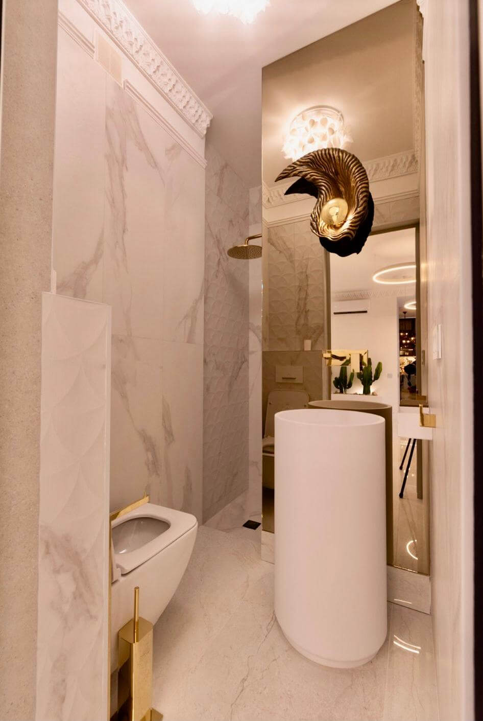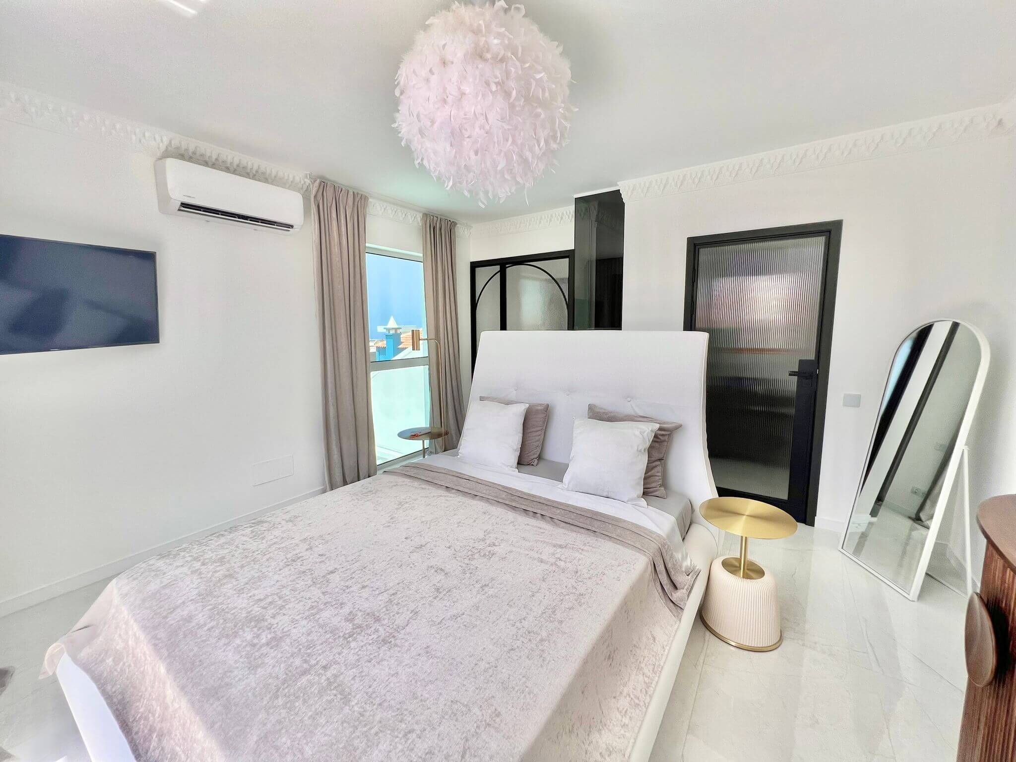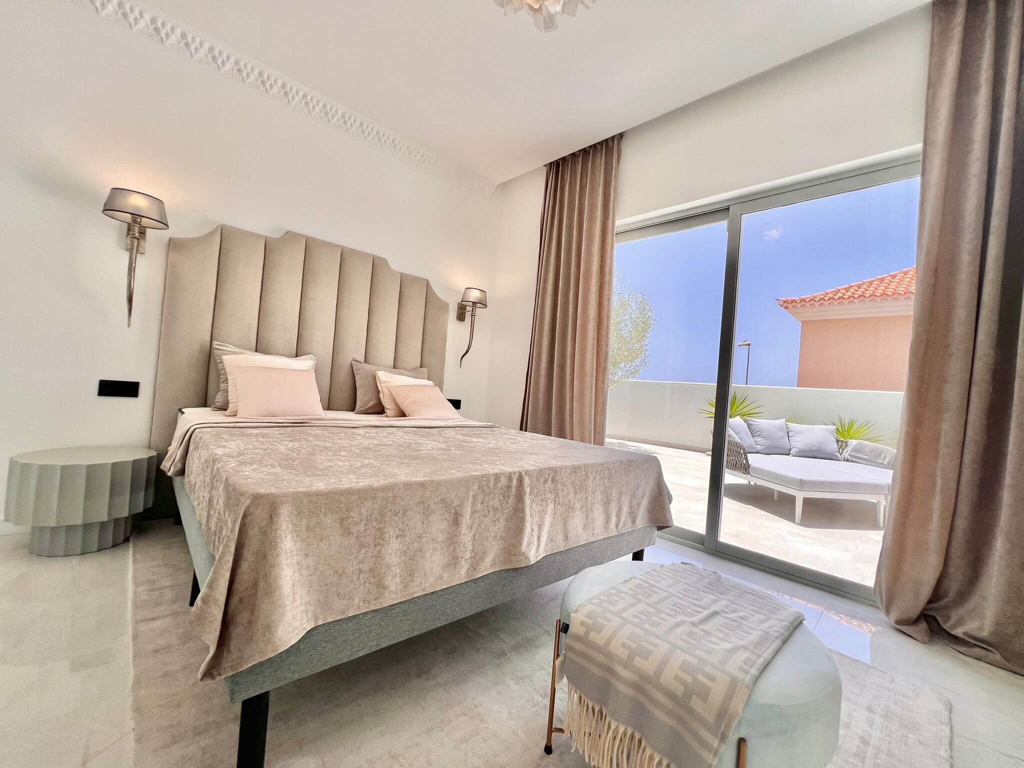 Спальня продумана для отдыха и спокойных утр — мягкие тона, простор и прямой выход на террасу с шезлонгами. Ванная комната выполнена в современном стиле: изящная чёрная ванна, светящееся зеркало и золотые детали добавляют ей особого шарма.