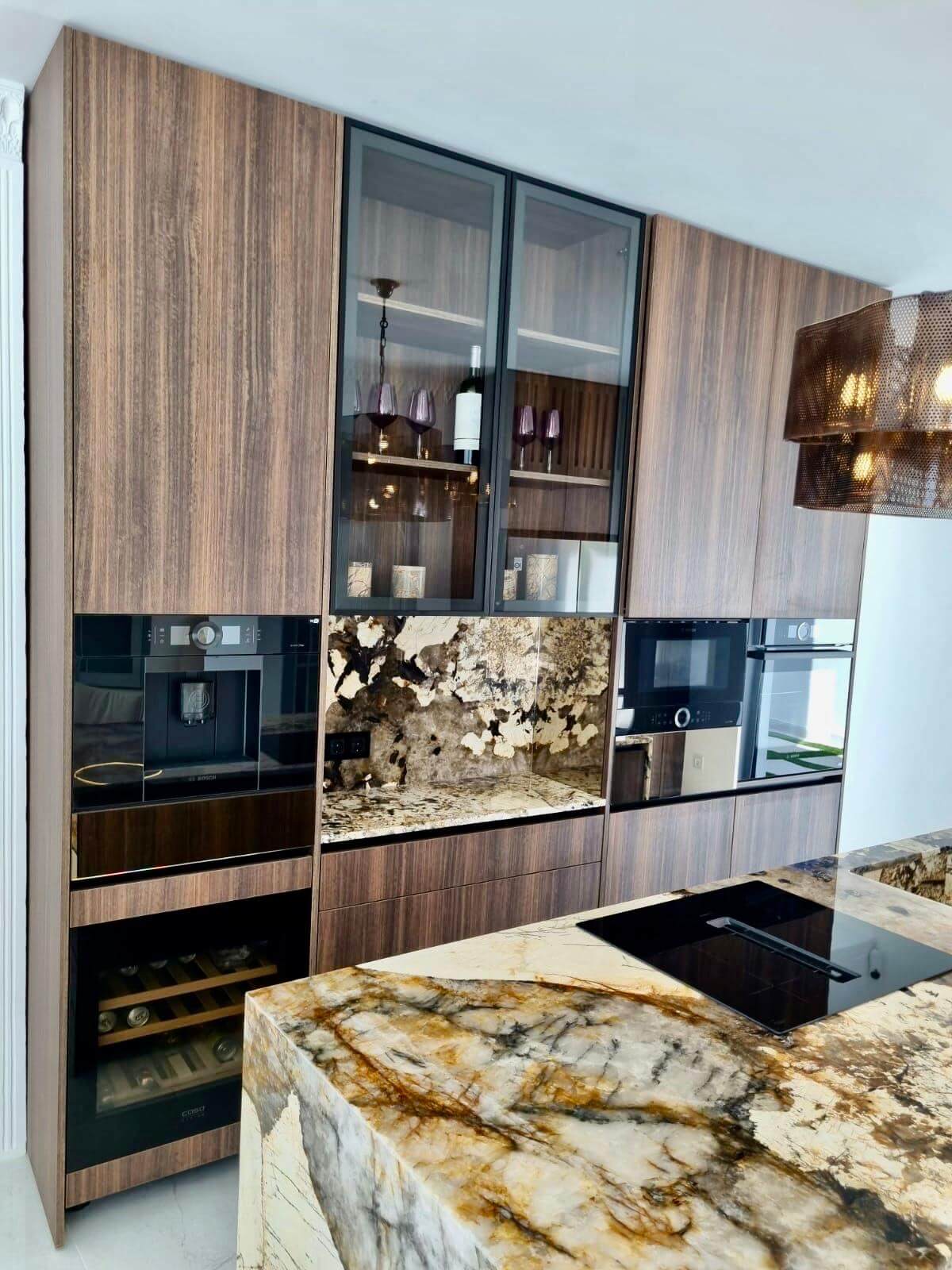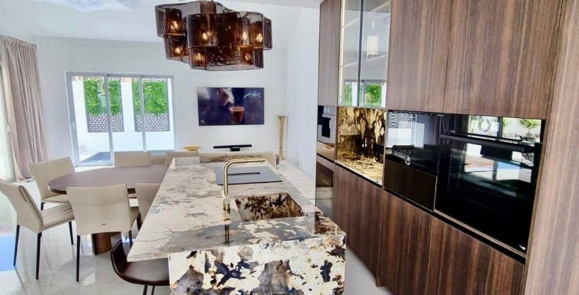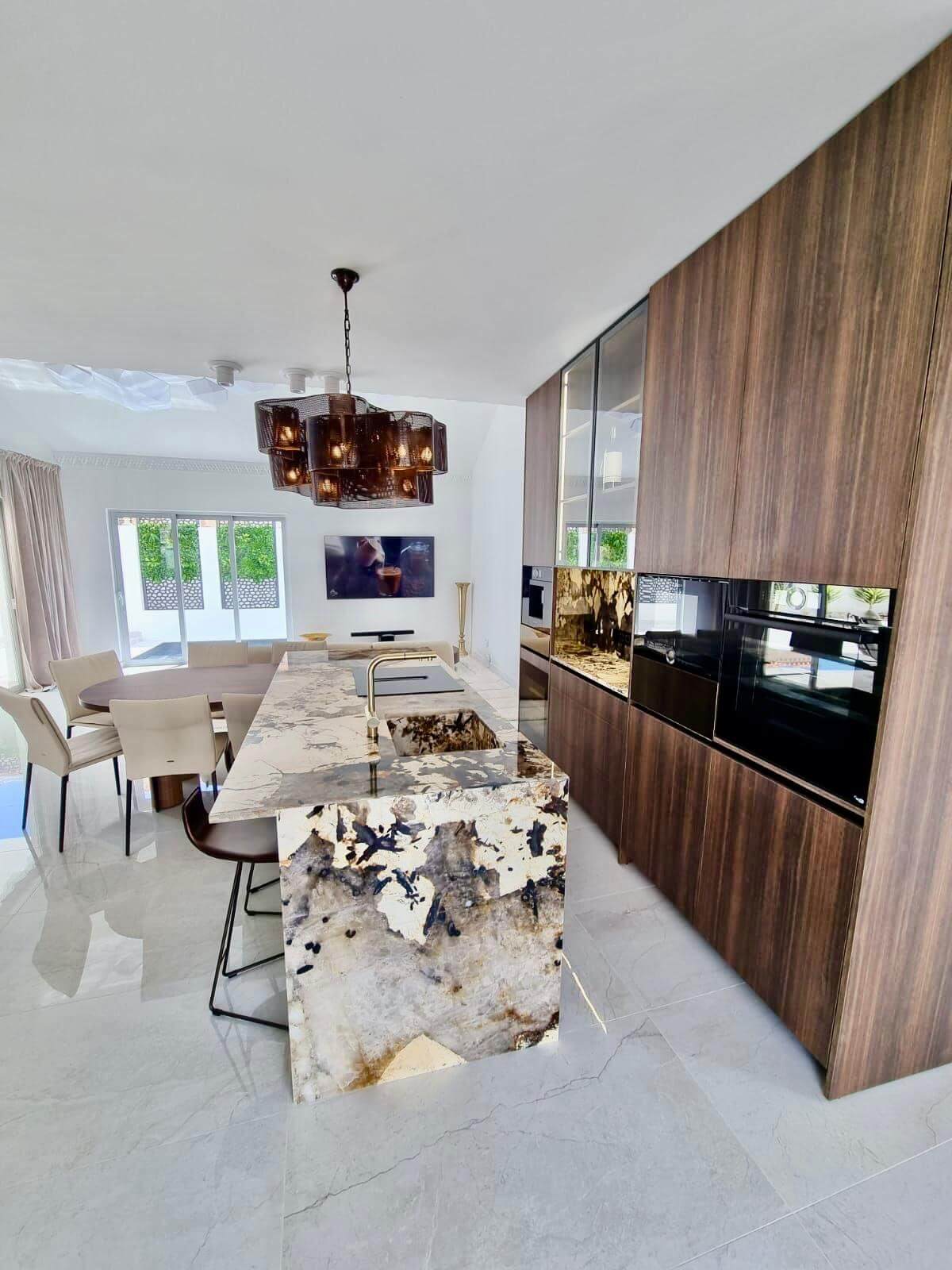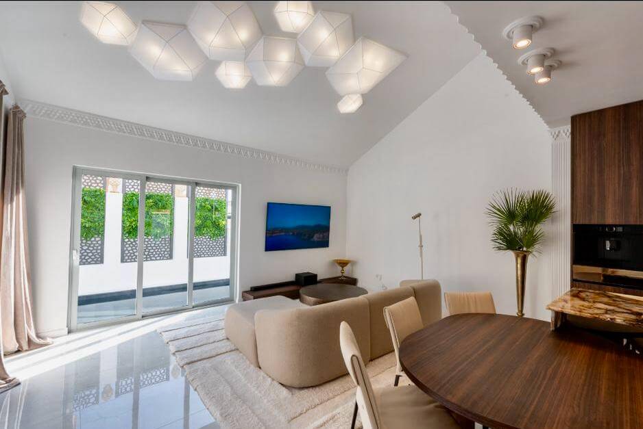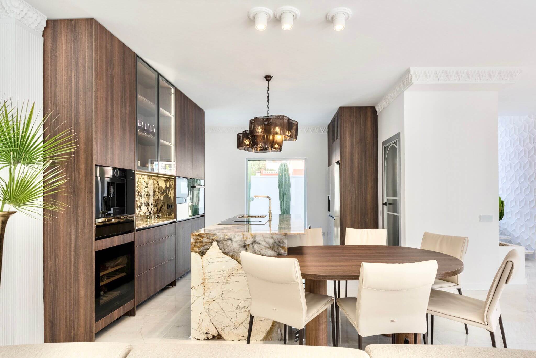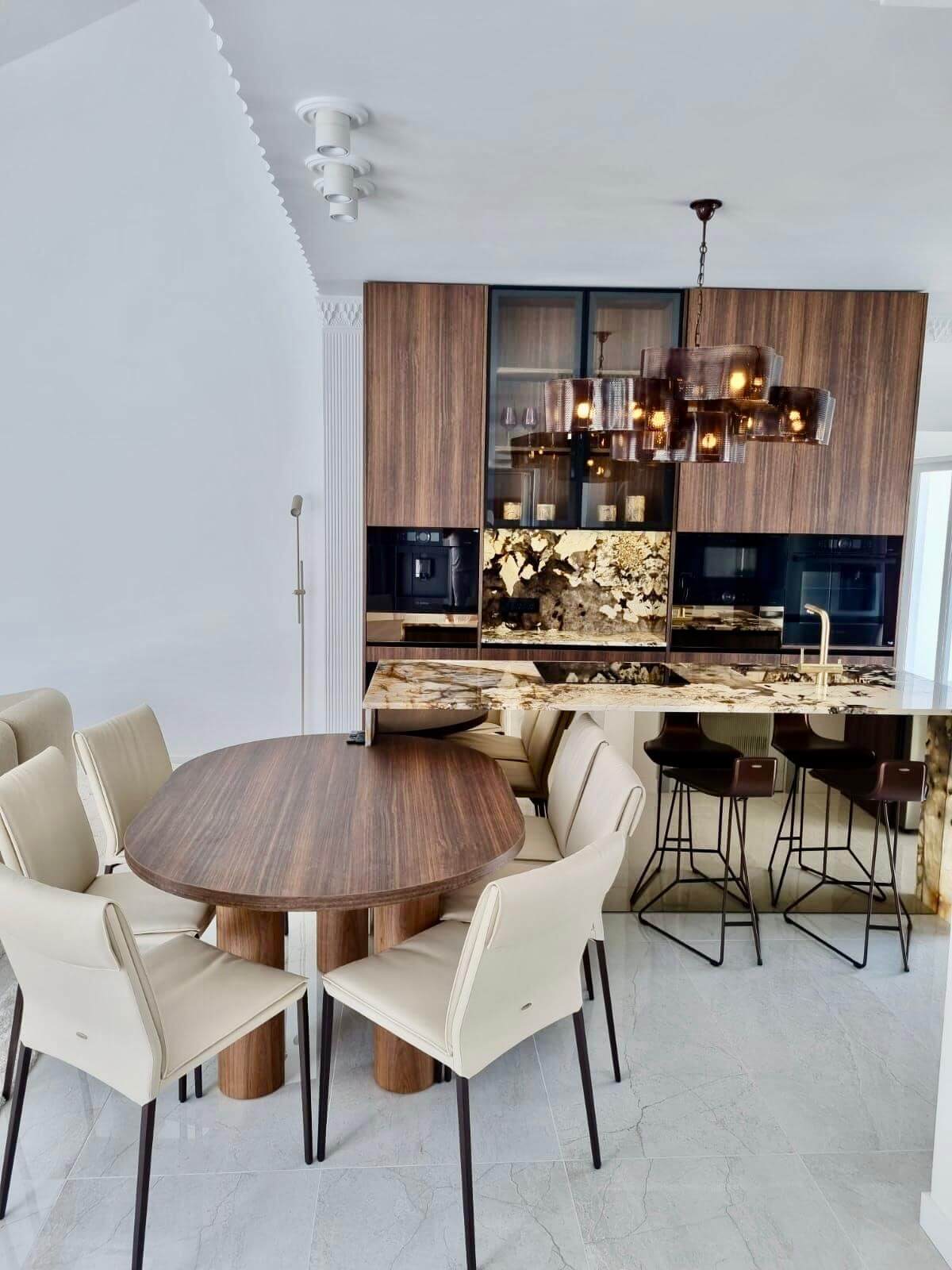 Внутри пространство наполнено светом. Гостиная с яркими акцентами выглядит по-домашнему уютно, а из больших окон открывается выход к зелёной террасе. На кухне внимание приковывает эффектный остров с мраморной столешницей — настоящий центр дома, где приятно собираться с семьёй и друзьями.