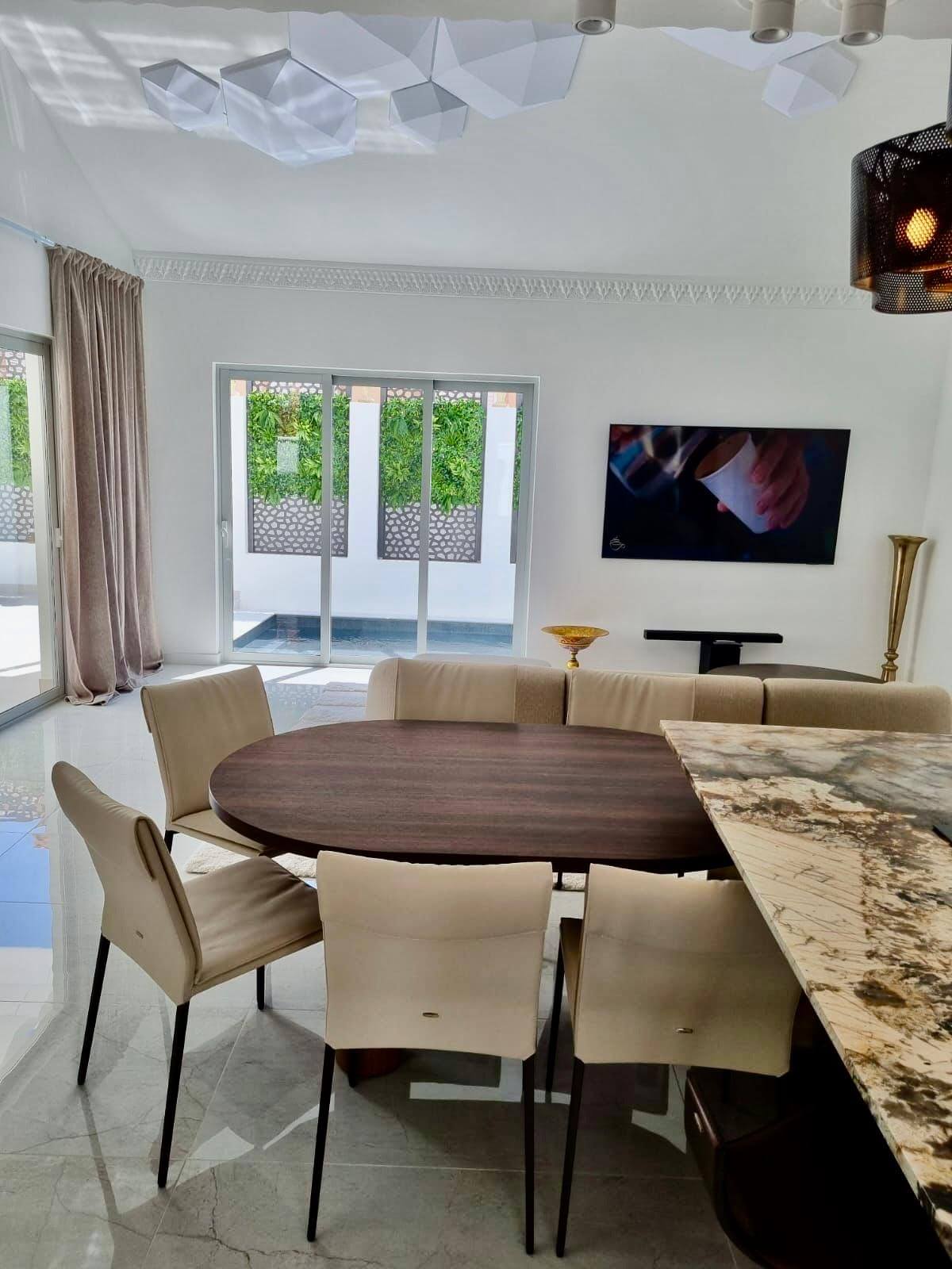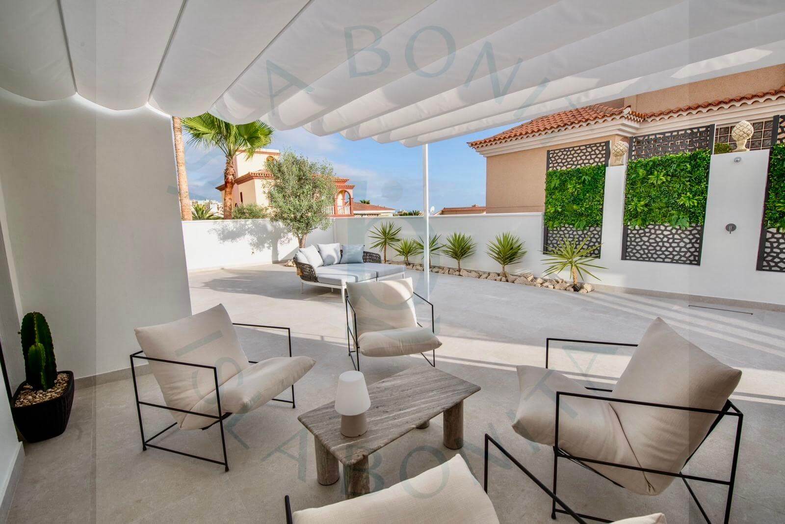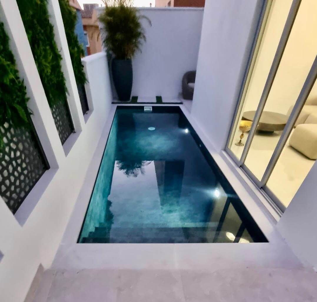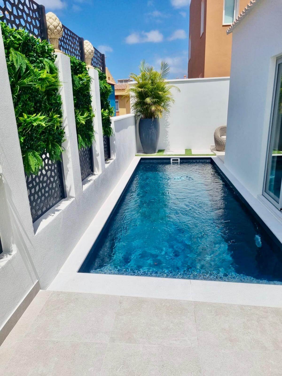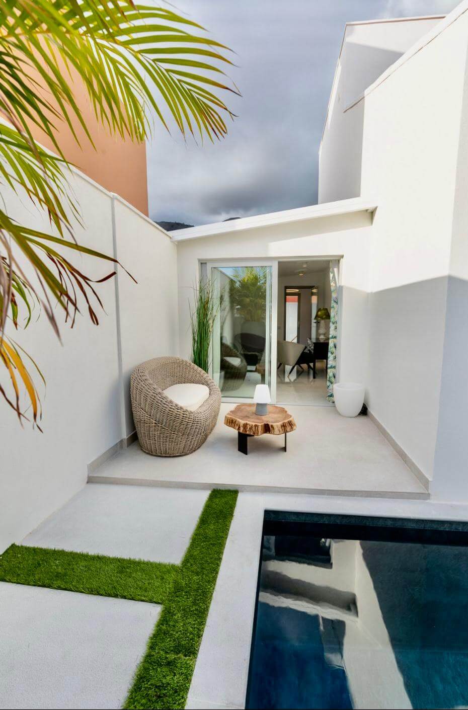 Дом построен на площади участка 500 м². Снаружи вилла радует собственным бассейном, окружённым зелёными вставками и стильным декором. Это пространство будто создано для того, чтобы наслаждаться солнцем и атмосферой уединения.