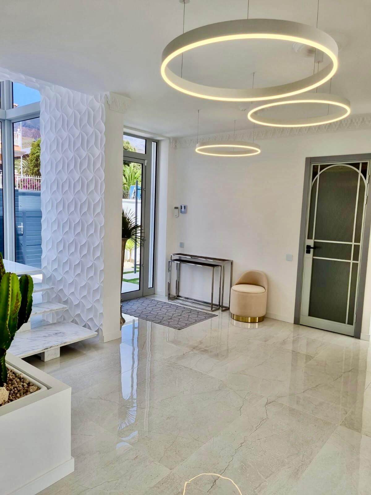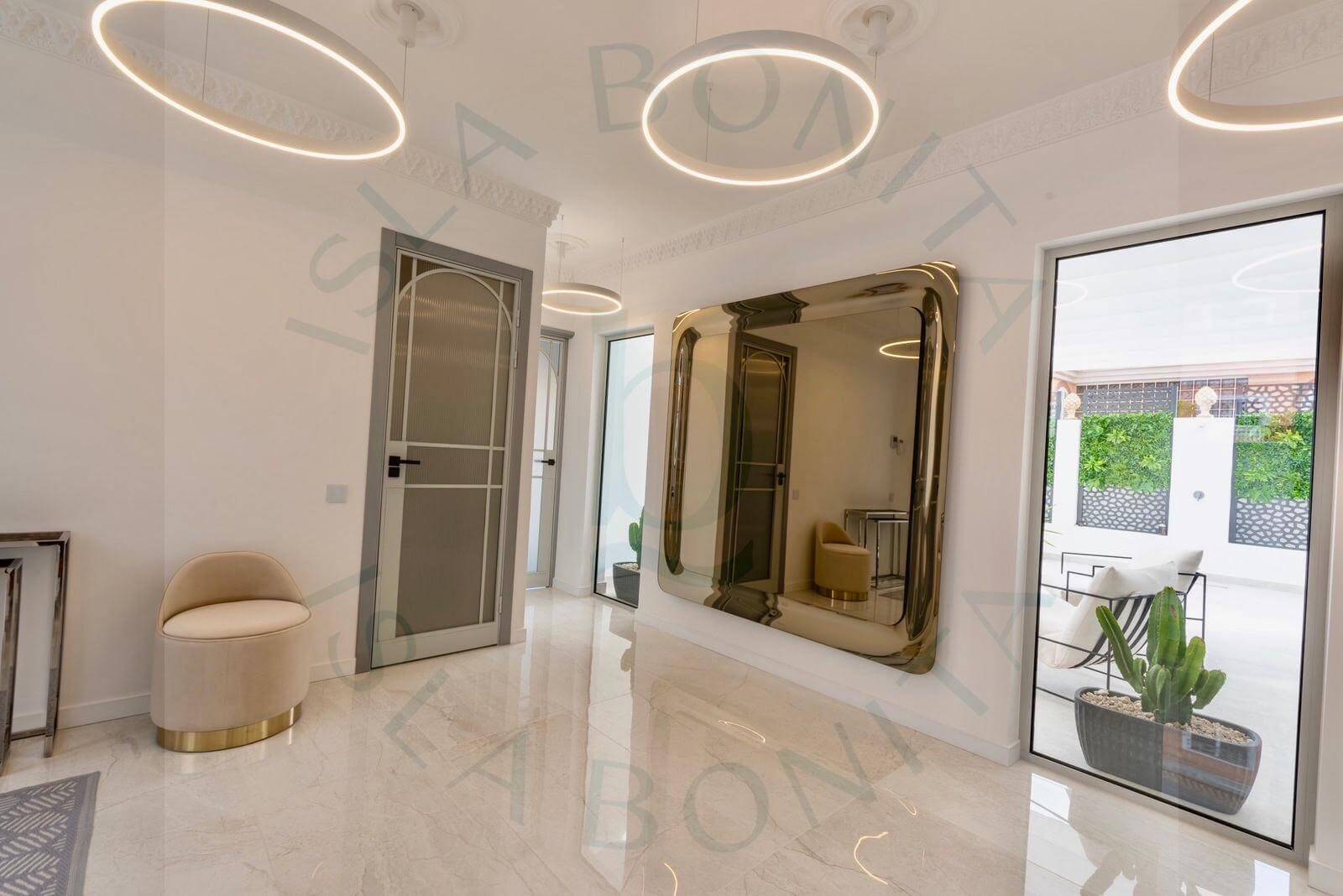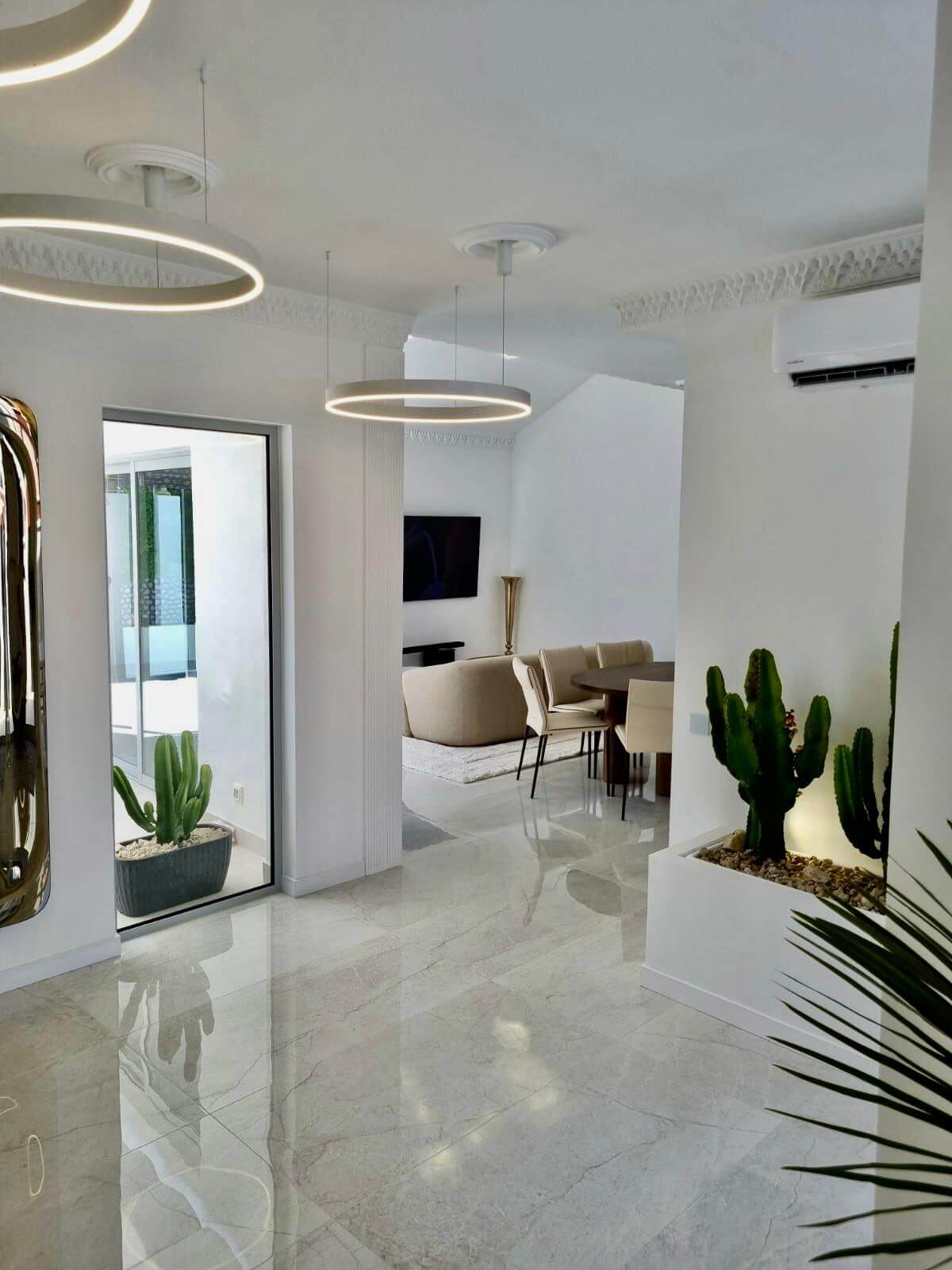 Эта современная вилла в районе Los Olivos сразу производит впечатление лёгкости и уюта. Белоснежные стены, прямые линии и свежая зелень вокруг создают атмосферу гармонии. Уже у входа чувствуется стиль — аккуратно выложенные дорожки, пальмы и вид на горы задают тон всему дому.